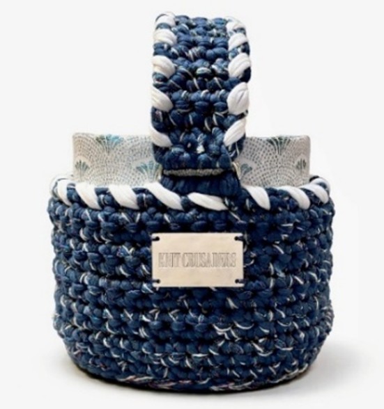 株式会社鴛海織物工場とファッションデザイナーの浅香有里氏が共創。博多織の伝統模様はその連続するリズムに、ニットの編み目が連なる構造との親和性を感じます。編むと織るという異なる技法がひとつになることで、大量生産では生まれない質感や存在感を目指しました。特別な日のものという印象が強かった博多織をカジュアルなフォルムのバッグに落とし込み、日常のスタイルにも、着物にも自然と馴染むニットプロダクトに仕上げました。