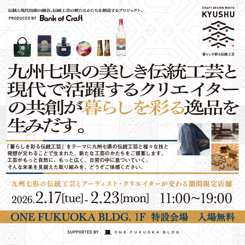 株式会社JTBと株式会社ジェーシービーの合弁会社である株式会社J&J事業創造の伝統工芸の継承と発展を目的とする「Bank of Craft」プロジェクトは、2026年2月17日(火)~2月23日(月・祝)まで福岡県福岡市のONE FUKUOKA BLDG.で体験型展示会「CRAFT DESIGN MEETS KYUSHU-暮らしを彩る伝統工芸-」を開催します。本リリースでは参加する九州7県の伝統工芸事業者と若手クリエイター、さらに両者が共創した作品の一部をご紹介します。