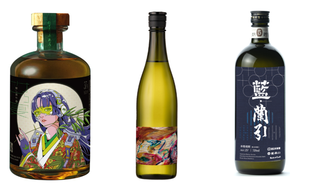 九州6県の酒蔵の協力の下、伝統工芸とクリエイターの共創デザインをラベルにした7種類のオリジナルお酒ボトルを販売(各種約30本限定)。会場では試飲もできます。また、株式会社西日本新聞社が170年の歴史を持つ久留米絣の工房である藍森山・森山絣工房(ラベルデザインと藍染めの木箱を制作)、140年の歴史を持つゑびす酒造株式会社と共に制作したオリジナルボトル焼酎「藍・蘭引」も販売します。